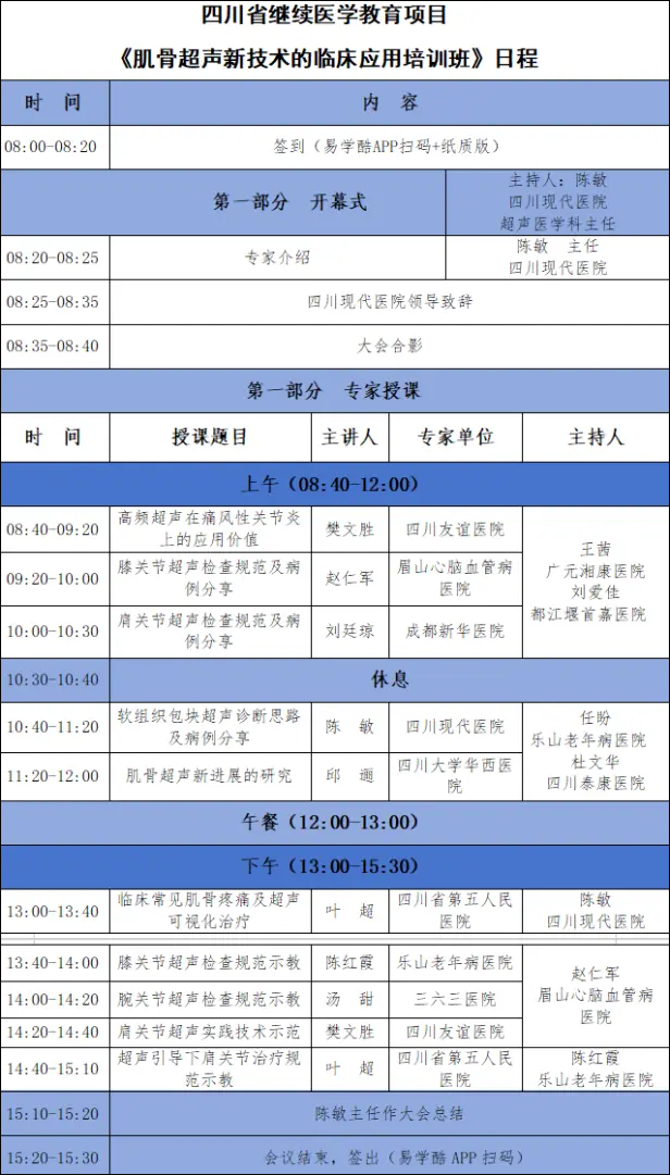 为了进一步探究和交流肌骨超声技术的最新进展理念和知识,加强学术交流及多学科交流协作,提升超声医学专业服务能力,由四川现代医院主办的“四川省继续教育项目《肌骨超声新技术的临床应用培训班》”(项目编号:(川)-25-001-09021627),将于2025年11月08日在成都举行。该学术会议系四川省继续教育项目,特邀请省内相关领域著名专家做专题讲座,欢迎广大医疗机构管理人员、超声医学科及相关专业的同仁们积极参与!