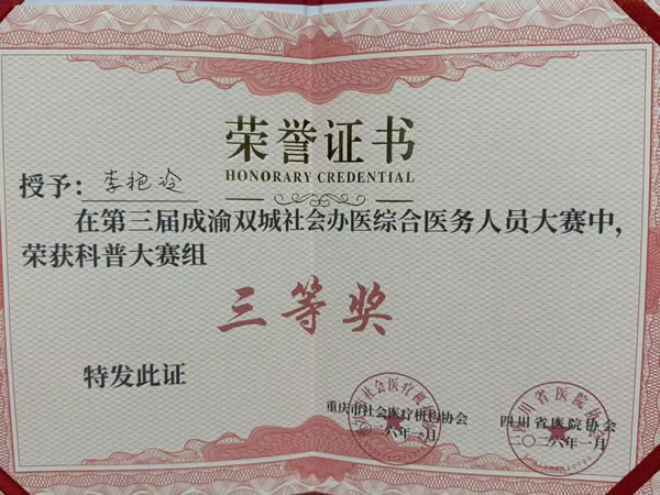 近日,第三届成渝双城社会办医医务人员综合技能大赛在重庆永川落下决赛帷幕。经过激烈角逐,我院代表队凭借出色的综合素质与稳定的现场发挥,从成渝两地31支社会办医精英队伍中脱颖而出,斩获团体综合三等奖、科普大赛三等奖!